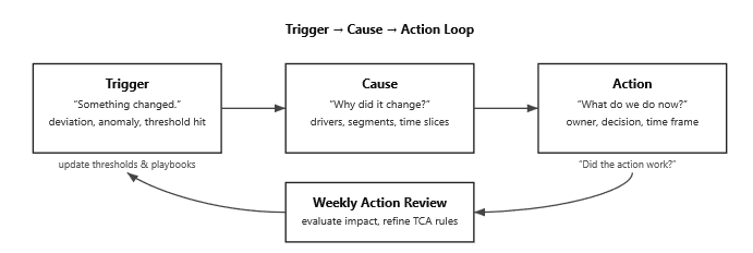 • Move users from “What happened?” to “What should we do next?” using the TCA (Trigger–Cause–Action) framework.