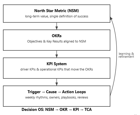 NSM, KPI architecture, TCA framework, dashboard psychology, and design patterns.
